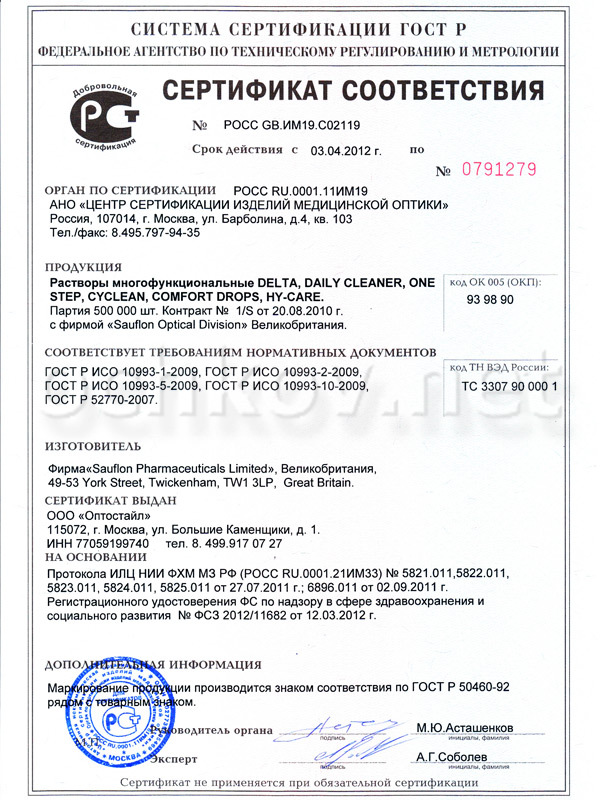 Многофункциональный раствор CyClean предназначен для очистки, дезинфекции, хранения и других способов ухода за контактными линзами любых типов. Данное средство выпускает британская компания Sauflon, продукция которой отличается хорошим качеством и безопасностью для глаз.
